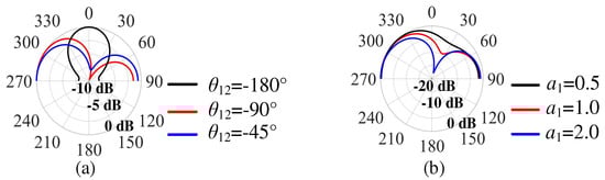 Figure 6 gives the calculated E-plane radiation patterns with different θ12 and a1 according to (5). Figure 6a illustrates the case of −180° < θ12 < 0°, with the radiation beam moving from a broadside direction to an endfire direction, indicating that Patch 2 acted as director. The elevation angle decreased with increasing θ12. The elevation angle remained almost unchanged when a1 increased from 0.5 to 2, as shown in Figure 6b.