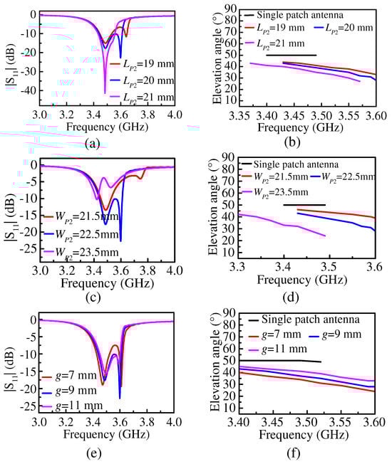 Subsequently, the key parameters that affect |S11| and the elevation angle of the proposed Ant. 1 were analyzed, such parameters mainly including the length of the shortened patch LP2, the width of the shortened patch WP2, and the distance between the shortened patch and the open patch g, as shown in Figure 8.