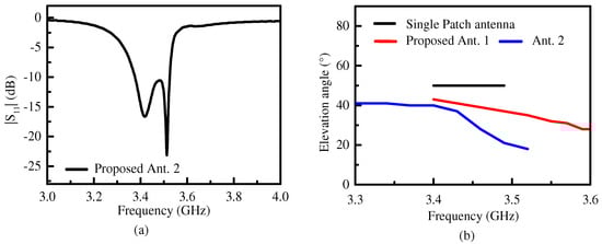 Figure 10a is the simulated |S11| of the proposed Ant. 2. There are two reflection zeros and the −10 dB impedance matching bandwidth ranged from 3.37 GHz to 3.52 GHz and corresponded to 4.3% in fraction. As shown in Figure 10b, the lowest elevation angle of 19° was lower than that of the proposed Ant. 1. The elevation angle gradually decreased from 40° to 19° as the frequency increased. This is because the coupling of MS3 with MS4 in relation to the proposed Ant. 2 increased with increasing frequency, so the elevation angle was further reduced, although the overall size was larger than that of the proposed Ant. 1.