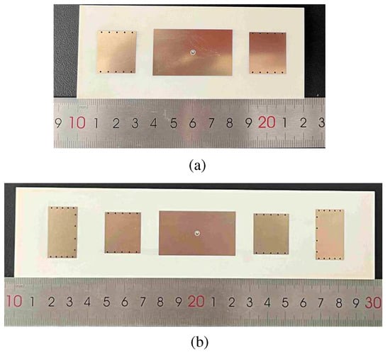 In order to verify the radiation characteristics of the proposed bidirectional quasi-endfire patch antenna, based on the above analysis, two prototypes of the two proposed antennas were designed and measured, as shown in Figure 11. The detailed dimensions of the proposed Ant. 1 were: Lg = 120, Wg = 50, LP1 = 42, WP1 = 25, LP2 = 20, WP2 = 22.5, D1 = 0.8, g = 9, g1 = 3.2, D2 = 2.1, g2 = 0.3, and h = 3.148, where the unit is mm. The detailed dimensions of the proposed Ant. 2 were: Lg = 200, Wg = 50, LP1 = 43, WP1 = 25, LP2 = 20, WP2 = 23, LP3 = 16, WP3 = 28.5, g = 10, D1 = 0.8, g1 = 3.2, D2 = 2.1, g2 = 0.3, g3 = 15, g4 = 2.2, and g5 = 6.2, where the unit is mm.