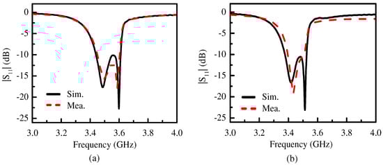 The S-parameter was measured using the Keysight N5230C vector network analyzer (Keysight Technologies, Santa Clara, CA, USA). The radiation patterns and the beam elevation angles were measured inside an anechoic chamber with a far-field antenna measurement system. Figure 12 shows the simulated and measured |S11| of two proposed antennas. The −10 dB impedance matching bandwidth of the proposed Ant. 1 was about 4.3% (3.45–3.6 GHz), as shown in Figure 12a, and the peak gain of the proposed Ant. 1 was about 5.2 dBi. The −10 dB impedance matching bandwidth of the proposed Ant. 2 was about 3.2% (3.4–3.51 GHz), as shown in Figure 12b, and the peak gain of the proposed Ant. 2 was 6.0 dBi. The small discrepancy between the simulated and measured results was due to the manufacturing tolerance and the measurement error.