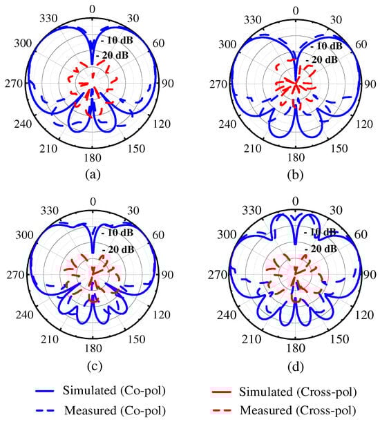 Figure 13 illustrates the simulated and measured radiation patterns of two proposed antennas on the E-plane at two reflection zeros. For the proposed Ant. 1, the elevation angles at two reflection zeros were ±40° and ±28°, as shown in Figure 13a,b. For the proposed Ant. 2, the elevation angles at two reflection zeros were ±40° and ±19°, as shown in Figure 13c,d. The measured cross polarization levels were both below −20 dB.