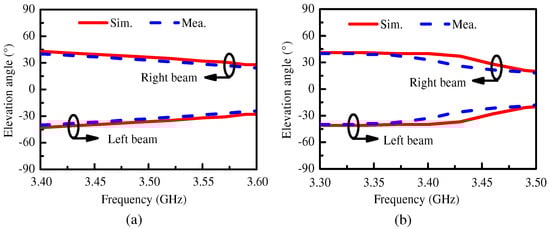 Figure 14 presents the simulated and measured elevation angles within the operating bandwidth for the two proposed antennas. From Figure 14, it can be seen that the elevation angle of the proposed Ant. 1 ranged from ±40° to ±28° in the operating bandwidth and the elevation angle of the proposed Ant. 2 ranged from ±40° to ±19° in the operating bandwidth. The elevation angle decreased with increasing frequency. The measured results are in agreement with the simulated outputs.