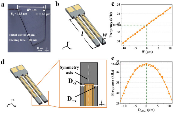 (a) Etching groove with an initial width of 70 μm etched in 100 min; (b) ultra-small quartz MEMS tuning fork resonator; (c) the effect of beam width on resonant frequency; (d) surface etching grooves of the tuning fork and its offset; (e) the effect of Doffset on the resonant frequency.