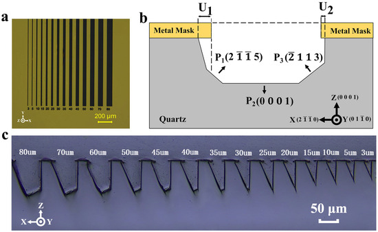 Although Hedlund [30] and Liang [22] have already reported the definition of a Z-cut quartz plane etched profile morphology, this definition was only suitable for macroscopic descriptions of etching results with large hard mask widths. For the purpose of this work, a novel and concise definition was proposed to satisfy the characterization of small-hard-mask-width etching profiles. As shown in Figure 2b, a complete bilateral etched groove is demonstrated in this work, which is different from previous work where only half of the etched profile was defined. And angles were not imported into the definition, which would greatly simplify the characterization of the etching profile. Instead, three planes were defined (P1, P2, P3), which made it easier to present the evolution of the etching profiles. In particular, this work made full use of undercuts to design a new fabrication compensation process; therefore, the depths of the undercuts were exclusively represented by U1 and U2, respectively. This definition of the profile focused the variables on characterizing the complete evolution of the etching groove itself, rather than the individual etching rate, which would facilitate the hard mask width to enable the design of a number of novel processes in practical engineering applications.