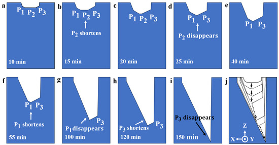The etching evolution of grooves with 45 μm initial width in 150 min. (a) The three etching planes appeared; (b) P2 shrunk gradually; (c) P2 shrunk gradually; (d) P2 disappeared. (e) P1 shrunk gradually; (f) P1 shrunk gradually; (g) P1 disappeared; (h) P3 shrunk gradually; (i) P3 disappeared; (j) the complete evolution.