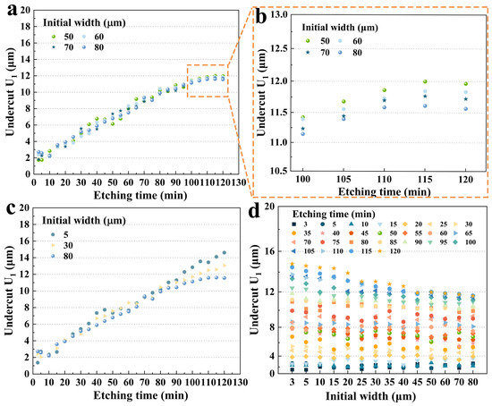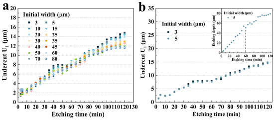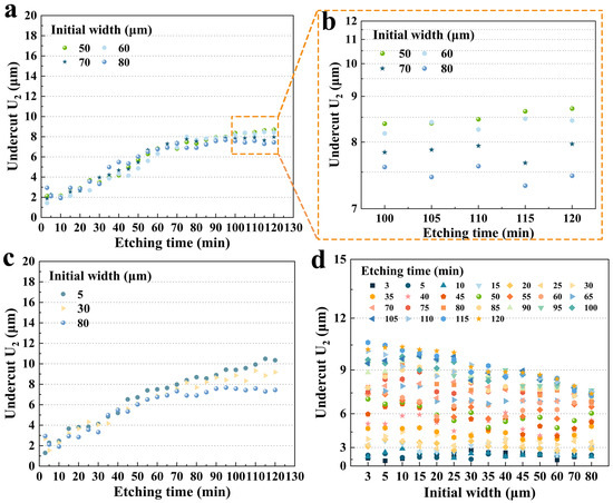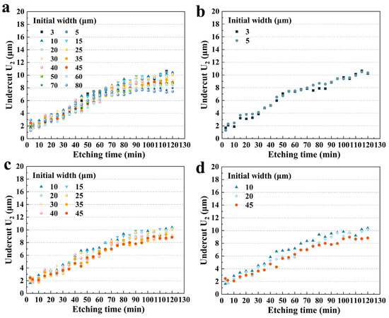 Figure 10c shows three sets of data with large differences in initial widths. Overall, for a fixed etching time, a larger initial width resulted in a smaller U2. Over the period of 100 to 120 min, the average undercut depth of 5 μm was 10.5% and 24.9% higher than that of 30 μm and 80 μm, respectively. And this difference in etching became remarkable after 80 min. It is more comprehensively illustrated in Figure 10d, which shows the U2 of various hard mask widths for fixed etching times. It was clear that around 80 min, the size effect became more pronounced. According to the etching profile evolution, the P3 platform was becoming smaller and disappearing during this period and the etching depth of the groove was almost reaching the limit. Therefore, it could be hypothesized that less of the etchant was drawn into the etching groove to participate in the reaction according to the etching kinetics, and the corresponding etching rate in the X direction slowed down and tended to stabilize. Furthermore, different initial widths would result in different times for the P3 to shrink, which would lead to various times for the reduction in the etchant in etching grooves and ultimately result in different etching depths of U2.