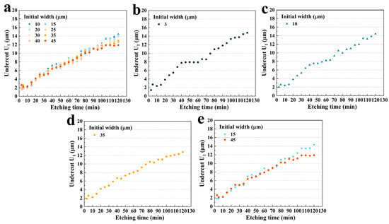 (a) U1 for group B versus etching time; (b) U1 with an initial width of 3 μm versus etching time; (c) U1 with an initial width of 10 μm versus etching time; (d) U1 with an initial width of 35 μm versus etching time. (e) The U1 with initial widths of 15 μm and 45 μm versus etching time.