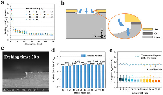 (a) The etching rate Vu1 versus etching time for different initial widths; (b) schematic diagram of etchant-etched metal layer and formed undercut; (c) SEM image of a hard mask width of 40 μm etched for 30 s; (d) the standard deviation of the etching rate from 75 to 120 min for representative widths; (e) box plots for etching grooves from 10 to 120 min.