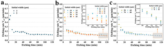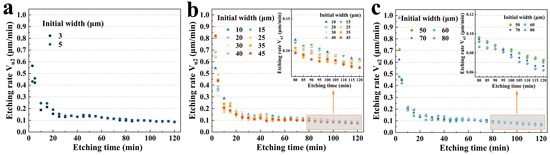 In more detail, as shown in Figure 8a, for group A, the etching rate (0.469 μm/min, 3 μm; 0.465 μm/min, 5 μm) decreased to 0.123 μm/min for 3 μm, and 0.122 μm/min for 5 μm, which was a nearly 3.8-fold decrease. However, there was no significant difference in the etching rate because the initial widths of the two were not considerably different. Figure 8b illustrates the Vu1 for group B. Similarly, in the first 5 min, the etching rate was almost 3.7 (40 μm) to 6.8 (10 μm) times that of 120 min. More interestingly, as shown in the inset of Figure 8b, after 100 min, the size effect was much more obvious. It was evident that an increase in the initial width decreased the etching rate Vu1. The etching rate of 45 μm (0.09 μm/min) was 21.2% lower than that of 10 μm (0.12 μm/min). Group C exhibited more pronounced trends, as shown in Figure 8c and its inset.