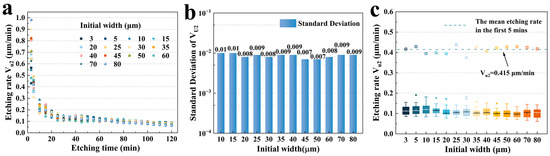 (a) The etching rate Vu2 versus etching time for different initial widths; (b) standard deviation of the Vu2 from 80 min to 120 min for representative widths; (c) box plot of each groove from 20 min to 120 min.