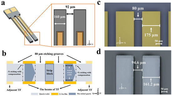 Figure 13a shows the diagram of the fabricated tuning fork and its target beam width size. The target width of the beam was 160 μm and the target gap between the two beams was 92 μm. Etching width compensation could effectively improve the actual etching accuracy. Figure 13b illustrates the principle of etching width dimensional compensation. The core idea of etching width compensation is to compensate for the depth of the undercut to achieve the designed dimensions based on the etching laws of the chosen initial etching width.