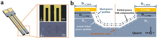 Furthermore, due to the anisotropic etching of the quartz crystal, the undercut affected not only the apparent shape but also the position symmetry of the device, which also markedly influenced the characteristics of the quartz devices. As shown in Figure 1d, the surface etching grooves were the critical parts which were used to reduce the resonant impedance of the quartz tuning fork [26,27,28]. However, the offset of the etching grooves caused by anisotropic etching significantly affected the performance of it. In Formula (2), describes the displacement of the surface etching groove caused by anisotropy etching. and are the distances of the surface etching groove from −X and +X, respectively.