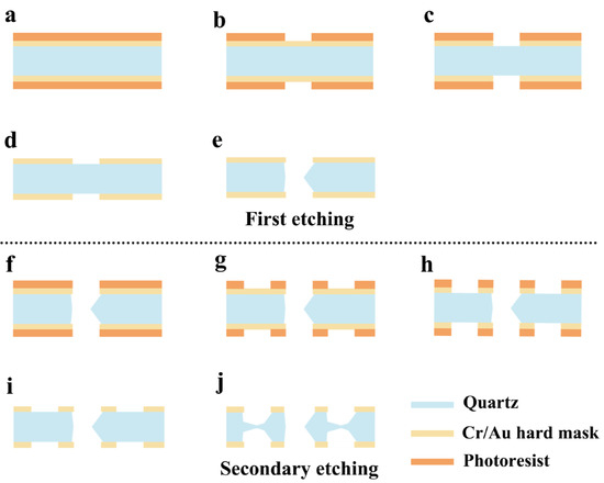 (a) The quartz wafer with metal hard mask and photoresist; (b) lithography and development of device shape; (c) pattern of the Cr/Au hard mask; (d) remove photoresist; (e) etch device shape in etchant; (f) spray photoresist; (g) secondary lithography and development of surface etching grooves; (h) pattern of the Cr/Au hard mask; (i) remove photoresist; (j) etch surface etching grooves in etchant.