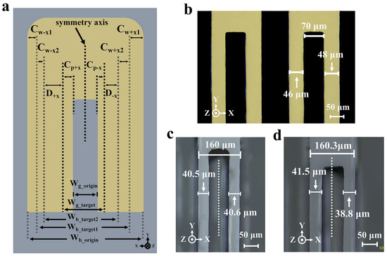 However, according to the previous analysis, the undercut would have different etching characteristics in the +X and −X directions, which could result in an offset between the actual surface etching groove and the desired one. Even worse, this offset had an extremely pronounced effect on the tuning fork characteristics, as mentioned in Figure 1e. Therefore, it became critical to correct the position of the etching groove by means of etching position compensation. Figure 14b shows the principle of etching position compensation. The core idea was to predict the offset caused by the anisotropic undercut based on the etching laws for the selected initial width and to reserve the corresponding position compensation in the design of the pattern mask. Obviously, the position of the etching groove was significantly offset in the +X direction relative to the position in the ideal state due to anisotropic etching. Nevertheless, as represented by the black dashed line, it was possible to predict the offset and correct the position of the etching grooves by using the etching laws of undercuts at different initial widths, which can significantly reduce the impact of offset.
