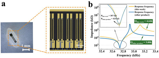 Finally, Figure 17a shows the ultra-small tuning fork device fabricated in this work. For size illustration, the device was placed next to a rice grain. The tuning fork was tested by an impedance analyzer at normal atmospheric pressure, and Figure 17b illustrates the testing results. It is worth noting that with these meticulous compensation strategies, it was even possible to use the metal deposition and laser frequency tuning processes, which greatly enhanced production efficiency. Furthermore, a tuning fork manufactured by a certain company was used for comparison. The impedance of this working tuning fork was 8.7% lower and the quality factor Q was 54.6% higher than that of the comparison one.