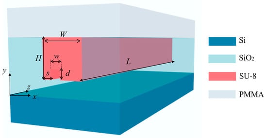 Figure 1 depicts the 3D schematic of the proposed mode rotator, which consists of a SiO2 buffer layer, an SU-8 core, and a polymethyl-methacrylate (PMMA) cladding. The refractive indices of silica, SU-8, and PMMA are 1.4448, 1.5802 and 1.4456, respectively. The large refractive index difference between SU-8 and silica causes spot mismatch when light is transmitted from the fiber to the waveguide, but this can be solved by introducing SSC [] or using a high-NA fiber for coupling. This paper focuses on the design and tolerance of the rotators. This mode rotator structure is a multimode rectangular straight waveguide with a straight trench of width w, depth d, and position s. The optical mode is not disturbed without the introduction of the silica trench.