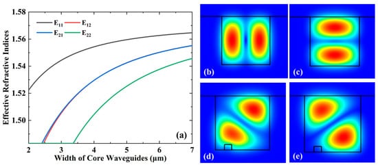 (a) Relationships between effective refractive indices of different modes with widths of core waveguides at 1550 nm while keeping H = W; optical mode distributions for the mode rotator (b) LP11a(E21) mode; (c) LP11b(E12) mode; (d) 1st LP11 mode; (e) 2nd LP11 mode.