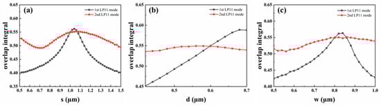 (a) Trench position s; (b) trench depth d; and (c) trench width w dependence of normalized overlap integral of 1st and 2nd LP11 modes shown in Figure 2c,d, with LP11a mode at a wavelength of 1550 nm.