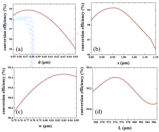 In order to improve the MCE, the parameters are further optimized. First, the width and position of the trench are fixed, and the depth d is optimized. As shown in Figure 4a, the conversion efficiency is optimized when d is 0.576 μm. Then, as shown in Figure 4b, we scanned the position s of the trench from the edge and obtained an optimal distance s of 0.955 μm. After obtaining the optimal d and s, the width of trench w is optimized as shown in Figure 4c, and the optimal value of w is 0.83 μm. Finally, the length of the mode rotator, L, is optimized after the parameters of the trench have been determined. As shown in Figure 4d, the best results are obtained when the length of the mode rotator is 973 μm. The optimized parameters of the mode rotator are summarized in Table 1.