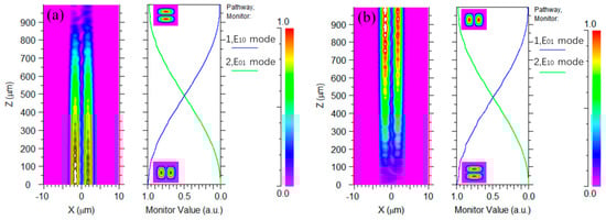 We used the beam propagation method (BPM) using the Rsoft software (Rsoft 8.0). As shown in Figure 5, the MCE from the LP11a (LP11b) mode to the LP11b (LP11a) mode at 1550 nm is improved to 99.2% by simulating and optimizing the size of the mode rotator. From the light-field transmission in Figure 5, the LP11a mode component is clearly visible, but not the LP11b mode component. This is because the field is zero at the center of the core in the vertical direction.