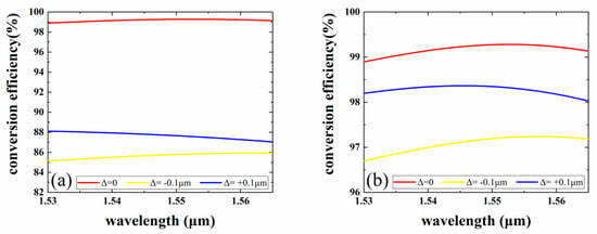 In this study, the polymer materials, SU-8 and PMMA, are chosen as the core and cladding films for the mode rotator. The processes for the mode rotator, including wet etching and inductively coupled plasma (ICP) etching, introduce unexcepted fabrication variations in trench width and position. At the same time, the nonlinear variation in the etching rate affects the depth of the trench. Therefore, fabrication errors are introduced. Manufacturing errors change the magnitude of the normalized overlap integral of the LP11a mode with the 1st and 2nd LP11 modes, which changes the angle of rotation of the optical field and ultimately affects the device conversion efficiency. Figure 7 shows the manufacturing error of the mode rotator when the LP11a mode is emitted at 1550 nm. We first discuss the effect of trench depth variation on the conversion efficiency. Figure 7a depicts the numerical results of the effect of the variation in the trench depth d on the MCE. The figure shows that ∆d is set to 0 and ±0.1 µm, and when d is set to ±0.1 µm, the MCE is substantially reduced to 85%. As shown in Figure 7b, the MCE of the mode rotator is greater than 96.6% when the trench width w is varied within ±0.1 µm design parameters. So, the width of this device can still be considered to have large process tolerances.
