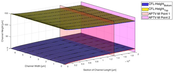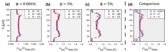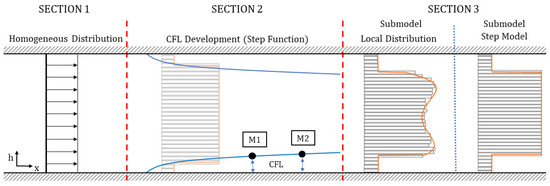 - Section 1—Homogeneous Distribution: The viscosity model is designed in such a way that the viscosity does not change only with channel height h, but also in the flow direction (x-axis), representing a particle-laden flow, which starts flowing from a homogeneous distribution. In Section 1, a homogeneous particle distribution is defined based on . It is assumed that this distribution will exist only over a short distance in flow direction, e.g., just for one micron. The definition of this length for the homogeneous distribution is empirical and is necessary for generating the CFL development discussed in Section 2.