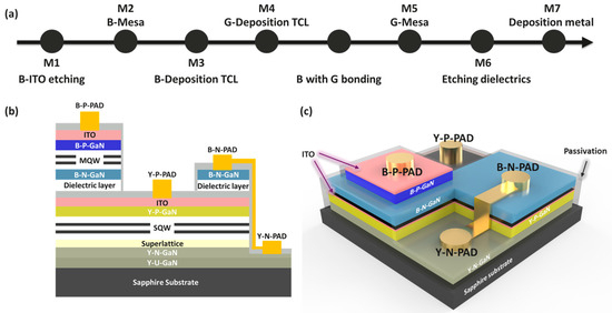 Blue and yellow vertically stacked mini-LEDs: (a) device fabrication flow; (b) schematic diagram of the cross-section; (c) schematic diagram of the 3D chip.