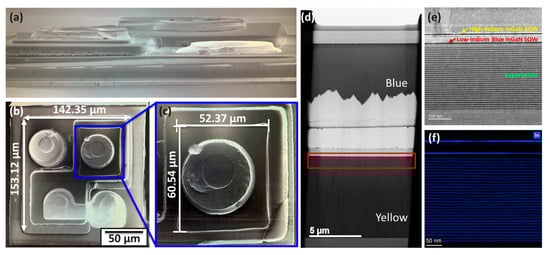 Scanning electron microscope (SEM) of blue and yellow light vertically stacked structures: (a) cross-section, (b) top view, (c) magnified image of blue light mini-LEDs. TEM (d) cross-section, (e) enlarged cross-section of yellow light InGaN epitaxial structure around the QW region. (f) EDS mapping of the In element of the yellow light InGaN epitaxial.