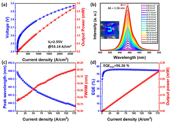 Blue mini-LED. (a) Voltage and output power as a function of current density. (b) EL spectra at different current densities. (c) Wavelength shift and FWHM difference as current density curves. (d) EQE–current density curve.