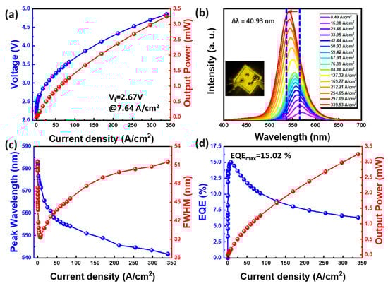 Yellow mini-LED. (a) Voltage and output power as a function of current density. (b) EL spectra at different current densities. (c) Wavelength shift and FWHM difference as current density curves. (d) EQE–current density curve.