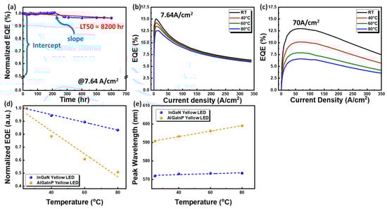 To ascertain the competitive advantage of InGaN yellow LEDs over AlGaInP yellow LEDs in market applications, we conducted a comparison of their EQE performance at different temperatures, as shown in Figure 6b–e. At room temperature (25 °C), the peak EQE values for InGaN yellow LEDs and commercially available AlGaInP yellow LEDs were observed at current densities of 7.64 A/cm2 and 70 A/cm2, respectively. Keeping the operating current densities fixed, we placed the devices on a heating plate to vary the measurement temperature (ranging from 25 to 80 °C). The EQE of AlGaInP LEDs decreased by 50% due to carrier overflow resulting from a small energy band shift between the active and cladding layers. In contrast, InGaN LEDs exhibited lower temperature dependence. Across the temperature range of 25 to 80 °C, the EQE of yellow InGaN LEDs decreased by only 17% due to reduced carrier spillage stemming from a larger energy band shift between the active and cladding layers, as shown in Figure 6d [31,32,33]. Additionally, yellow InGaN LEDs demonstrated superior performance in terms of wavelength shift. These findings confirm that InGaN yellow LEDs exhibit lower temperature dependence compared to AlGaInP yellow LEDs, making them more suitable for applications with higher operating temperatures.