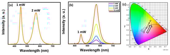 The vertically stacked blue and yellow mini-LEDs we designed feature separate blue and green electrodes, enabling individual control by supplying varying operating currents to achieve the modulation of the light source’s wavelength, as depicted in Figure 7. We kept the blue mini-LED operating power fixed at 1 mW while varying the yellow operating power from 1 to 10 mW. When the yellow mini-LED power is increased to 2 mW, the CIE coordinate is (0.33, 0.34), which closely approaches positive white light. The results for fixing the blue power to 1 mW and varying the yellow power (1–10 mW) are shown in Table 1. With a gradual increase in yellow mini-LED power, the light color transitions towards warm white, as illustrated in Figure 7b,c. The development of our blue and yellow vertically stacked mini-LEDs allows for adjusting the CIE coordinates by independently controlling the currents of the blue and green lights, facilitating a broader range of applications.