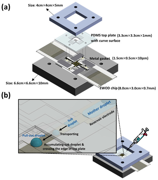 (a) Combination of the novel EWOD microfluidic platform. (b) Schematic diagram of droplet-pulling operation with curve PDMS top plate. In the novel EWOD platform, the team uses the metal gasket to create the interval space of the EWOD system and design the fixture to stabilize the novel EWOD system in the sandwich structure.
