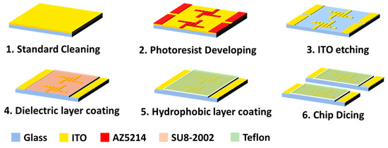 This research used ITO glass as the dielectric wetting wafer substrate (Ruilong Optoelectronics Co. Ltd., Miaoli, Taiwan). ITO material has been widely used in optoelectronics due to its high transparency and optical properties, which are convenient for observation and operation under a microscope and have ideal conductive properties. The wafer fabrication process used the photolithography process. In the first step, we performed the standard cleaning. The second step involved spin coating the 1.2 µm photoresist with 3000 rpm for 30 s and developing the pattern. After hard baking with 120 °C for 5 min, we performed the third step, ITO etching. The chip is immersed to the FeCl3/HCl etching solution at 45 °C for 110 s. The fourth step involves coating the SU8-2002 negative photoresist (Kayaku Advanced Materials, Inc., Westborough, MA, USA) as a 1.5 µm dielectric layer. In the fifth step, we spin coated with Teflon AF1600 (Teflon™ AF, Wilmington, DE, USA) solution with a 1.2 µm thickness for the hydrophobic layer on the wafer. In the sixth step, we diced the wafer into an EWOD chip as shown in Figure 2.