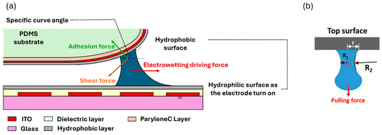 In the droplet pull-out conjecture model proposed by the team, when a droplet moves forward, we considered the increase in the gap between the chip and the curved upper cover, as shown in Figure 3a. The primary resistance under the curved surface structure is the adhesion force of the droplet. The adhesion force causes the droplet to form a liquid bridge between the gaps even if the distance is increased under the parallel plate structure, which causes the liquid sample to quickly stick on the top plate. According to the previous research formulas, the adhesion force of droplets in the vertical direction can be quantified based on the droplet radius and dimensions and integrated with the contact angle [10,11], as shown in Figure 3b.
