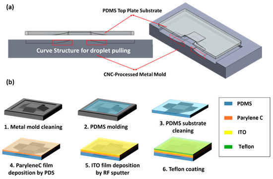 In this experiment, the team used silicon oil to create an oil environment to facilitate the generation and extraction of droplets. However, silicone oil can easily penetrate into the PDMS structure and cause the PDMS substrate to deform [12,13]. In order to solve the above problems, we selected Parylene C as the packaging material to isolate the contact between PDMS and silicone oil. We used ITO, the same as the dielectric wetting chip electrode material, as the ground electrode in the parallel plate operating area [14]. The curve top plate fabrication is shown in Figure 4b. First, we cleaned the metal mold by 95% alcohol. Second, we formed the PDMS structure with 10:1 A and B regent mixing, removed the bubble with vacuum environment, injected it into metal mold and let it solidify for 24 h. Third, we demolded the PDMS substrate and cleaned it with 95% alcohol. Fourth, we deposited the 5 µm Parylene C on the PDMS with a Polymer Deposition System (PDS) as the isolative layer. Fifth, we deposited the 230 nm ITO thin film by RF-sputter. Last, we sprayed the Teflon AF1600 solution on the top plate and placed it in a room temperature environment for 72 h to form the hydrophobic layer.