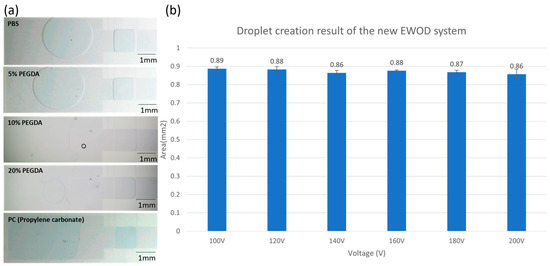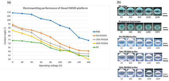 In this study, we selected DI water, propylene carbonate (PC, purchased from Echo Chemical Co., LTD., Miaoli County, Taiwan) and polyethylene glycol diacrylate (PEGDA, Merck Taipei, Taiwan) as the sample for novel EWOD platform performance testing.