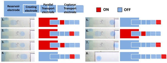 After successfully controlling the generation of droplets, we conducted the pull-out droplet test using the curved surface structure to pull droplets out of the parallel plate structure. There have been multiple operation processes and the switching sequence of the control electrodes to complete the droplet pull-out step, as shown in Figure 7.