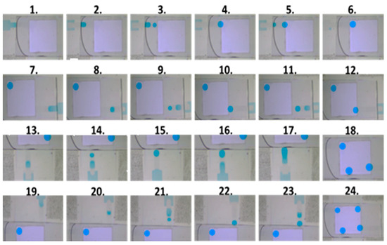 For the multi-channel operation shown in Figure 8, we employed LabVIEW 2017 control software for droplet generation and pull-out operations. In the figure, steps 1~6, 7~12, 13~18, and 19~24 correspond to droplet generation and extraction operations in the left, right, lower, and upper curved channels, respectively. Take the left channel as an example; steps 1 and 2 were the first droplet creations in the left channel. Step 3 was the second droplet creation, and step 4 combined the first and second droplets. The third droplet creation was shown as step 5, and step 6 was the pull-out operation of the combined droplet of three sub-droplets.