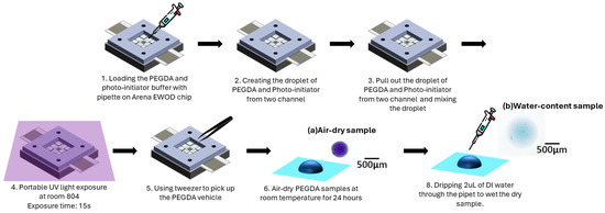 Using a dual channel to generate hydrogel droplets and photopolymer droplets, the team overlaid different numbers of droplets, performed mixing, and exposed the mixture in an open area. The experimental workflow for hydrogel solution manipulation in the dielectric wetting system is illustrated in Figure 9. The experimental process first uses a pipette to drop appropriate volumes of hydrogel solution and photo-initiator solution sequentially from the holes on the curved surface onto the reservoir electrode of the EWOD chip. Subsequently, the sub-droplets of the hydrogel solution and the photoreceptor solution are generated, superimposed, and pulled out through electrode operation. After the sub-droplets are pulled-out from the parallel-plate region in the EWOD system, the droplets are mixed and exposed to UV light for curing in the single-plate region with a coplanar electrode array. Finally, during the exposure period, solidified samples were extracted using forceps and stored in a Petri dish with a diameter of 6 cm.