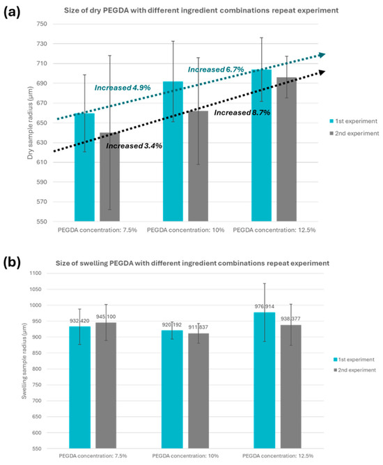 Size measurement results of air-dried and swelling PEGDA samples. (a) Radius size (in µm) of naturally air-dried PEGDA microparticles and (b) swelling PEGDA microparticles. Since different hydrogel and photocuring agent liquid concentration combinations have different structural densities of the synthesized hydrogel particles, the structural stability, swelling performance, water content and other physical properties of the gel during the swelling process are different.