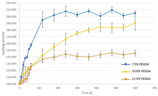In contrast, the 12.5% sample group had a relatively limited volume swelling ratio, reaching a steady swelling ratio of 1.45. Within the initial 1 min of immersion in DI water, the swelling volume of this sample gradually increased from 1.04 to 1.26 and reached 1.42 at 2 min, starting to plateau. In summary, the 7.5% hydrogel sample exhibited the most significant swelling ratio change, which was followed by the 10% sample. The 12.5% hydrogel showed the smallest swelling ratio with minimal volume changes during the water absorption process. We observed that the swelling rate of the 10% and 12.5% samples had a large standard deviation in the first 150 s. During this time, the trend of swelling efficacy is mainly influenced by the surface area and environmental evaporation, both of which affect the contact for moisture absorption. As time progresses, the moisture evaporation and absorption within PEGDA reach equilibrium, allowing us to clearly observe different swelling rate performances among PEGDA concentrations.