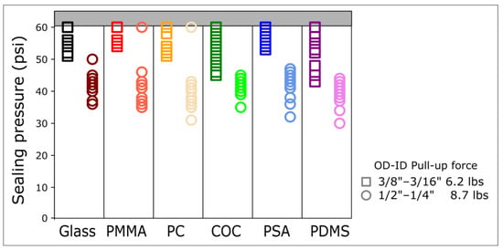 Sealing pressure of magnetic connectors across a wide range of materials. The sealing pressure was measured for glass, polymethyl methacrylate (PMMA), polycarbonate (PC), cyclic olefin copolymer (COC), pressure-sensitive adhesive (PSA), and polydimethylsiloxane (PDMS) using two ring magnets of different sizes and pull-up forces. The thickness of all the materials tested was 1 mm. The highest injection pressure was limited to 60 psi. Per material, data were generated with at least 3 different connectors and data points were repeated 3 times for each connector.