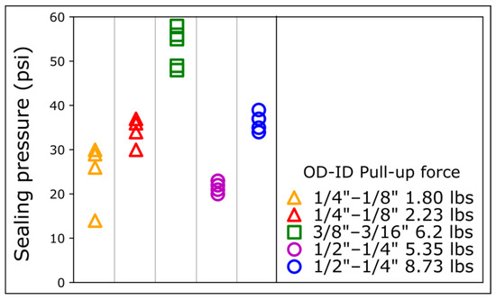 Interestingly, despite a lower pull-up force, the 6.2 lbs 3/8″ OD connectors provided a higher sealing pressure than the 8.73 lbs ½″ OD connectors. To further elucidate the relationship between sealing pressure, pull-up force, and diameter, we measured the sealing pressure of magnets of different sizes and pull-up forces on COC (Figure 3). Despite a much lower pull-up force, the 2.23 lbs ¼″ OD and the 1.8 lbs ¼″ OD connectors provided a sealing pressure comparable to the 8.73 lbs ½″ OD and 5.35 lbs ½″ OD, respectively (Figure 3).