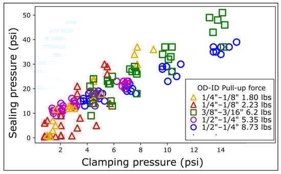 The sealing pressure increases linearly with the clamping pressure. The data for the different OD magnetic connectors align roughly on the same master curve but still have some significant spread (Figure 4). Data from magnetic rings with the same OD align better with each other, underlining the need to consider the exact contact surface area. The narrower ¼″ OD magnetic connectors exhibit variability in sealing pressure at low clamping pressures (0–4 psi, Figure 4). The spread of the data for the narrowest magnetic connectors is attributed to the lower mechanical stability of the contact at low magnetic clamping pressure. More precisely, the PDMS dome at the top of the magnetic ring is rounder for the narrowest connectors, making them sensitive to the torque generated by the tubing (Figure S2).