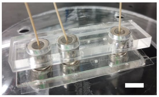 Stabilizing jig. 3/8″ OD magnetic connectors are stabilized with 5.5 mm thick laser-cut acrylic jigs. The scale bar represents 10 mm.