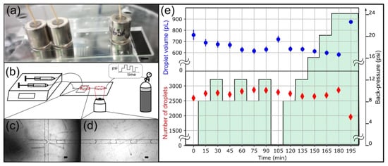 Next, we sought to characterize the performance of magnetic connectors at longer timescales. We tested their practical utility for droplet generation, which is sensitive to flow perturbation. A small leak in the system would translate into detectable droplet size and throughput fluctuations [11,27]. Using two syringe pumps, we injected water and a fluorinated oil solution into a COC/PSA droplet generator. We imposed varying backpressure to challenge the magnetic connectors at the inlets (Figure 6b). We generated droplets for over 3 h and recorded 500 images every 15 min (Figure 6c,d). The backpressure cycled between 8 and 12 psi before returning to 0 psi and increasing stepwise up to 24 psi (Figure 6e). We used the 6.2 lbs 3/8″ OD magnetic connectors in these experiments.