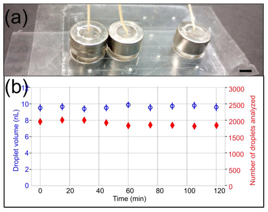 Droplet generation experiment with a 10 psi backpressure to evaluate the long-term stability of 8.73 lbs ½″ OD microfluidic magnetic connectors. (a) A side view of the device shows the arrangement of magnetic connectors. The scale bar represents 5 mm. (b) The droplet volume (blue) and the number of droplets detected and analyzed (red) are plotted over time. The data demonstrate the stability and absence of leakage over 2 h.