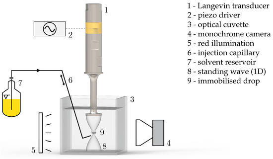 - Ruiken, J.P.; Villwock, J.; Kraume, M. Behaviour of Acoustically Levitated Drops in Mid-Water. Micromachines 2023, 14, 1923. [Google Scholar] [CrossRef] [PubMed]